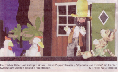 Ganz entsprach das Handpuppenspiel im Herder-Gymnasium dann doch nicht der Originalfassung der schwedischen Kinderbücher, wie die sechsjährige Jasmin Nommsen nach den ersten Szenen feststellte. Doch das mit lustigen Liedern angereicherte Theater gefiel ihr trotzdem gut. So gut, dass sie in der Pause ihren Großvater hinter die Bühne schickte - um ein Autogramm von Findus zu holen.
